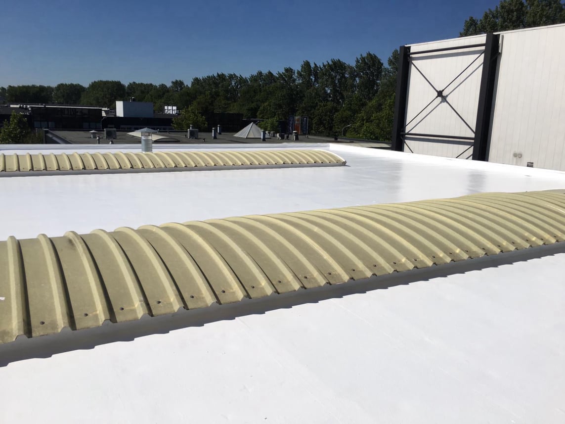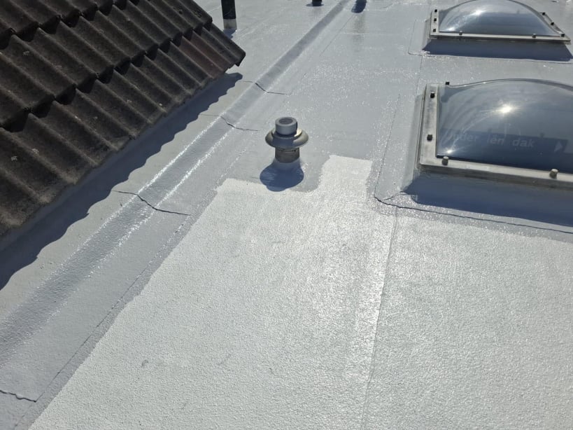 De vloeibare dakbedekking vormt een nieuwe, volledig naadloze beschermlaag en verlengt de levensduur van het bestaande dak met minimaal 25 jaar.